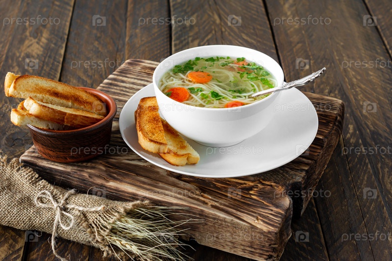 Традиционный куриный суп с лапшой и морковью подается в миске на деревянном фоне