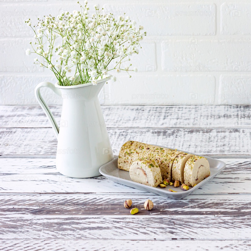 Нарезанная тахини халва с фисташками на белом деревянном столе, украшенном цветами