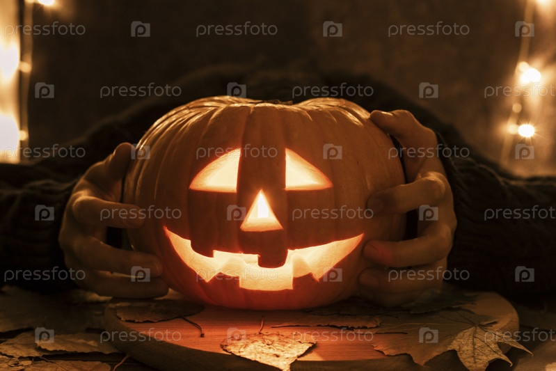 Фонарь Джека головы тыквы хеллоуина на темном фоне с сухими листьями. Светящиеся лица обмануть или угостить