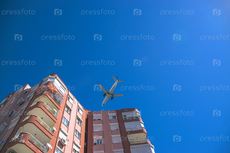Пассажирский самолет пролетает над жилым домом на фоне голубого неба и солнца