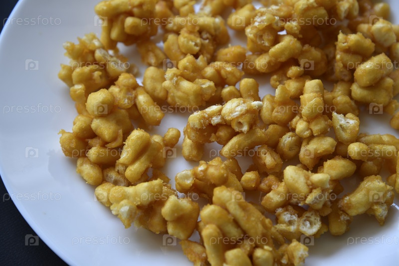 Сладкая закуска чак-чак в упаковке на белой тарелке. Медовая закуска из теста крупным планом