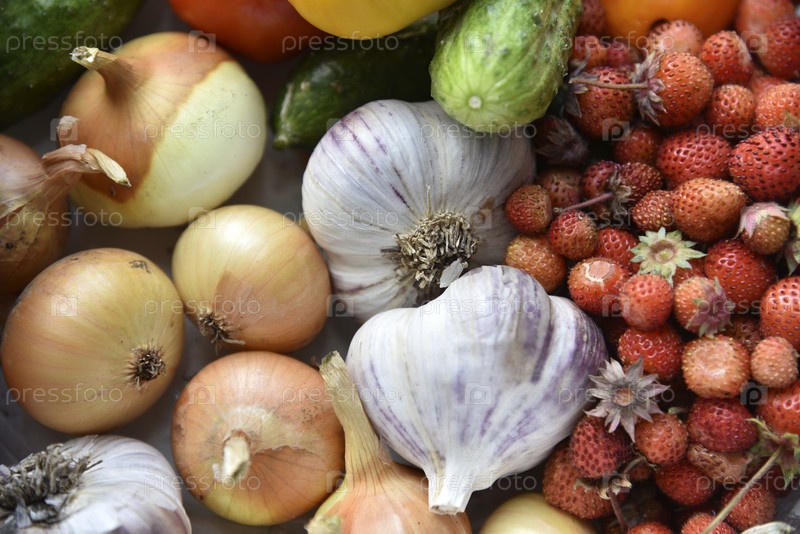 Овощи и ягоды крупным планом. Клубника, лук, огурцы и чеснок в куче осеннего урожая