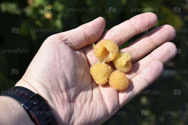 Спелая красивая желтая малина на ладони. Яркая свежая малина
