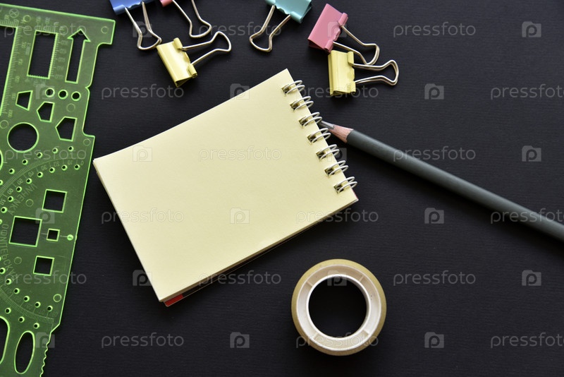 Офисный натюрморт. Карандаш и блокнот со скрепками на черном фоне