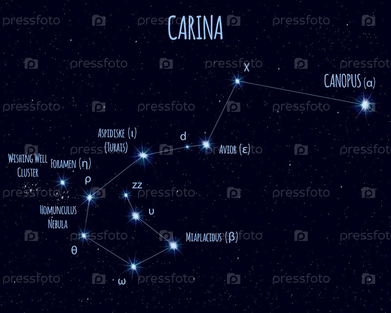 Созвездие Киля (Киль), иллюстрация с названиями основных звезд на фоне звездного неба
