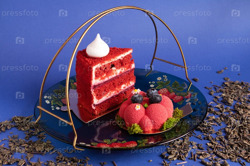 Два аппетитных вкусных красных пирожных на стеклянной тарелке с разбросанным сухим зеленым чаем на фиолетовом фоне