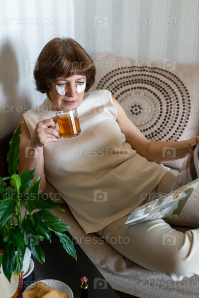 Счастливая красивая женщина средних лет читает журнал дома на диване после душа. Концепция ухода за собой. Домашний спа и отдых. Активная жизненная позиция старшего
