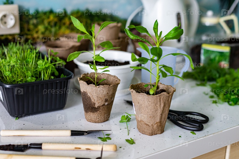 Домашнее садоводство и хобби. Цветы и петрушка с укропом в горшке на столе в окружении садовых инструментов и аксессуаров. Фон светлый