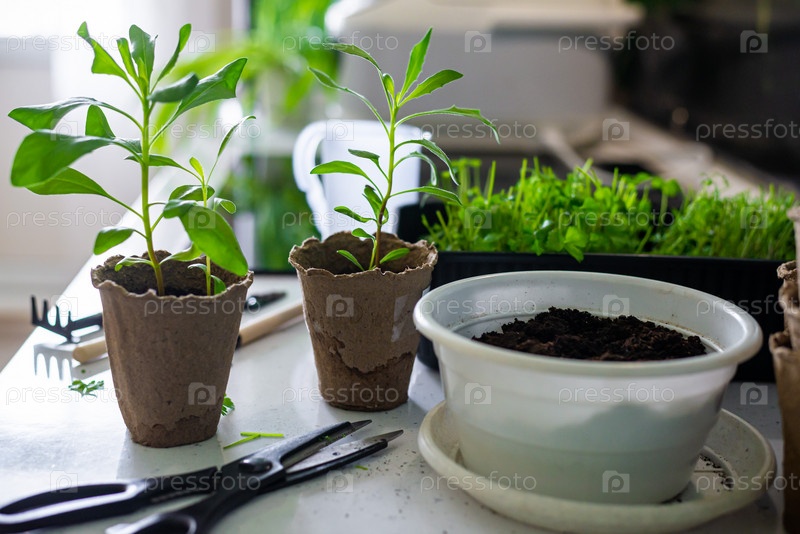 Домашнее садоводство и хобби. Цветы и петрушка с укропом в горшке на столе в окружении садовых инструментов и аксессуаров. Светлый фон, кухонный стол, крупный план