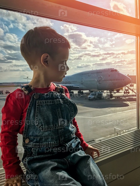 Маленький мальчик ждет посадки на рейс в транзитном зале аэропорта и смотрит в окно на самолет возле выхода на посадку. Активный семейный образ жизни, путешествия по воздуху с ребенком на летние каникулы