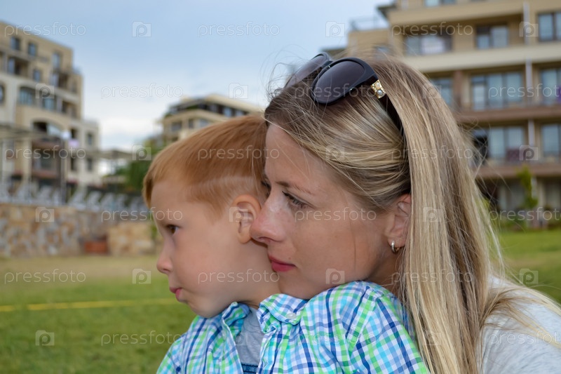 Молодая мать с мальчиком в отпуске, летний день в парке, семейный отдых, любовь и забота, обнимающий портрет крупным планом