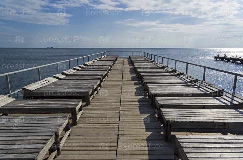Конец пляжного сезона. Пустая пляжная веранда с лежаками. Судак, Крым, конец сентября