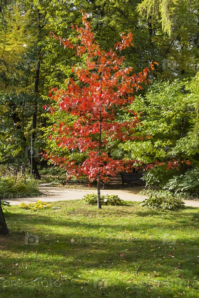 Дуб с покрасневшими листьями на фоне зеленых деревьев. Аптекарский Огород (филиал ботанического сада МГУ). Москва. Солнечный день в октябре