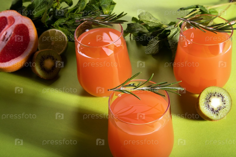 Состав стаканов с апельсиновым соком, нарезанным красным апельсином, лаймом, киви, розмарином и листьями мяты на светло-зеленом фоне
