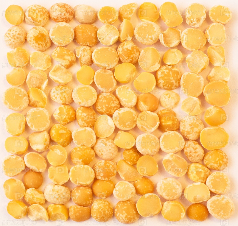Вид сверху на расколотые семена сушеного желтого гороха. Фон сырой пищи