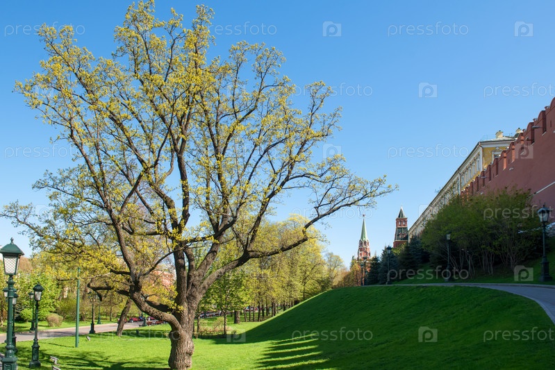 Вид на Александровский сад, башни и стены Московского Кремля в весенний день. Архитектура столицы России