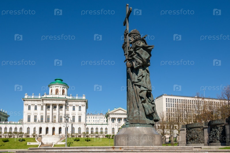 Москва, Россия - 10 мая 2021 года: Памятник Святому равноапостольному князю Владимиру Святославичу, Крестителю Руси, установлен на Манежной улице, напротив Дома Пашкова
