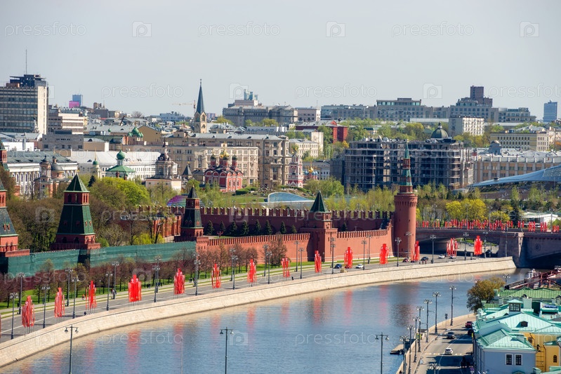 Вид с воздуха на Московский Кремль, Москву-реку и набережную Кремля в весенний день
