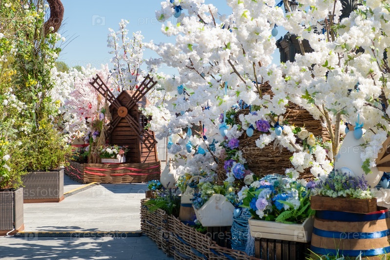 Сквер у Храма, украшенный цветами и фигурками к Пасхе