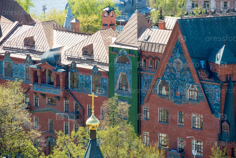 Москва, Россия - 10 мая 2021 г.: Вид сверху на многоквартирный дом Перцовой (1907 г.). Неорусское здание на углу Соймоновского проезда и Пречистенской набережной в Москве