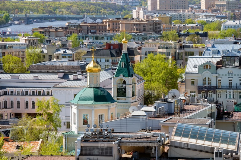 Вид сверху на храм Ильи Пророка и крыши жилых домов в Хамовническом районе Москвы