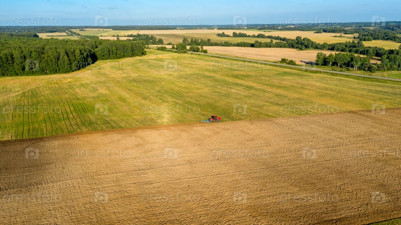 Живописный вид на рабочий трактор в поле сельскохозяйственного поля на летней ферме вечером. Аэрофотосъемка, вид сверху с дрона. Сельскохозяйственный район Московской области. Аграрная земля в летнее время. Красота земли