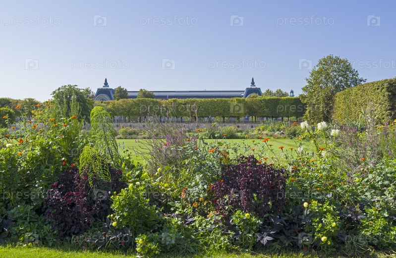 Цветы на газоне в саду Тюильри, Париж, Франция. Солнечный день в начале сентября