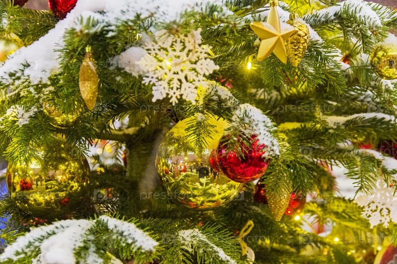 Заснеженные игрушки на стоящей на улице новогодней елке