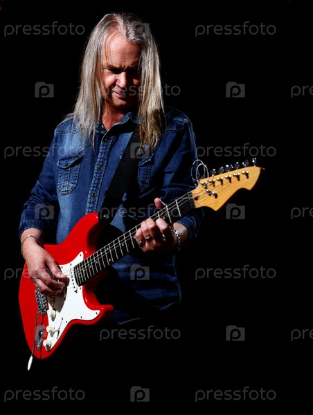 Пожилой мужчина с длинными седыми волосами в синей джинсовой рубашке играет на электрогитаре на черном фоне