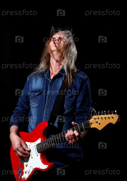 Пожилой мужчина с длинными седыми волосами в синей джинсовой рубашке играет на электрогитаре на черном фоне