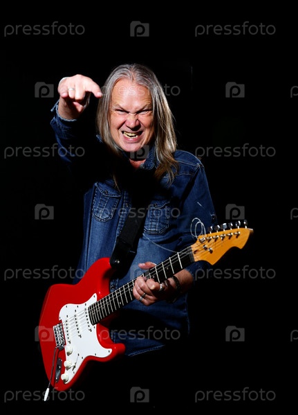 Пожилой мужчина с длинными седыми волосами в синей джинсовой рубашке играет на электрогитаре на черном фоне