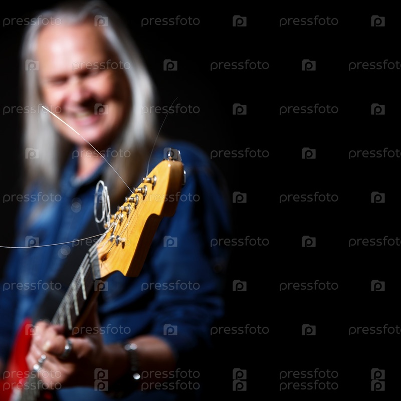 Пожилой мужчина с длинными седыми волосами в синей джинсовой рубашке играет на электрогитаре на черном фоне