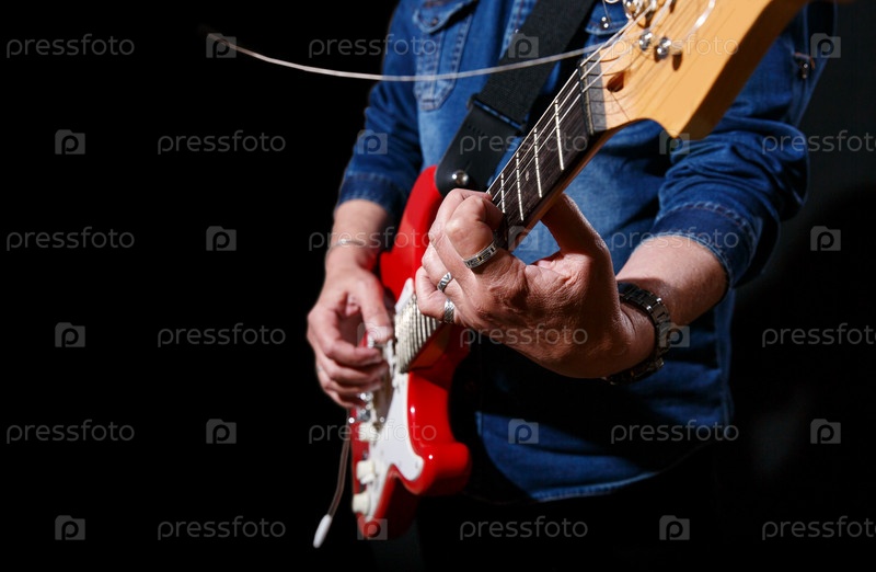 Пожилой мужчина в синей джинсовой рубашке играет на электрогитаре на черном фоне. руки крупным планом