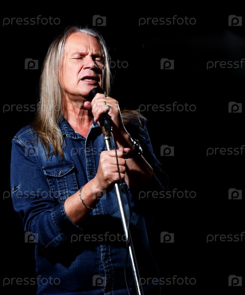 Пожилой мужчина с длинными седыми волосами в синей джинсовой рубашке поет в микрофон на сцене на черном фоне
