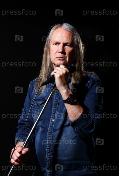 Пожилой мужчина с длинными седыми волосами в синей джинсовой рубашке поет в микрофон на сцене на черном фоне