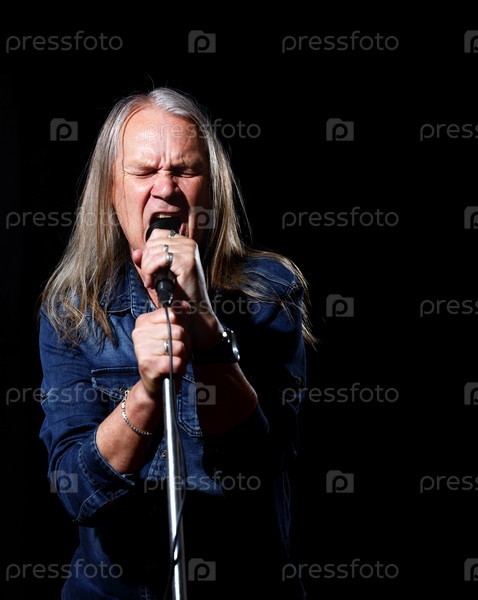 Пожилой мужчина с длинными седыми волосами в синей джинсовой рубашке поет в микрофон на сцене на черном фоне