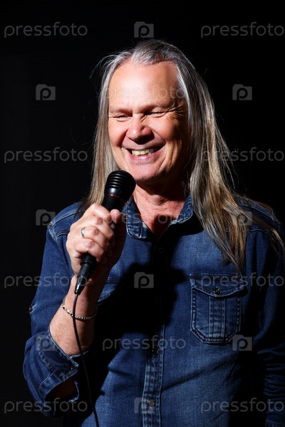 Пожилой мужчина с длинными седыми волосами в синей джинсовой рубашке поет в микрофон на сцене на черном фоне