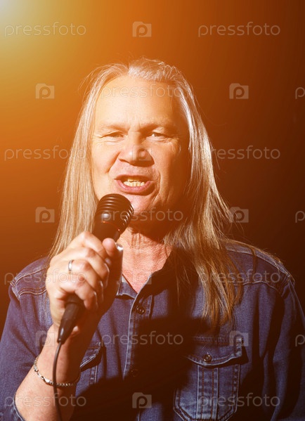 Пожилой мужчина с длинными седыми волосами в синей джинсовой рубашке поет в микрофон на сцене на черном фоне