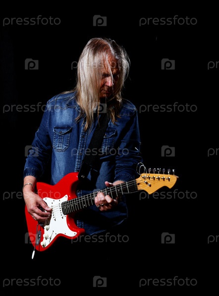 Пожилой мужчина с длинными седыми волосами в синей джинсовой рубашке играет на электрогитаре на черном фоне