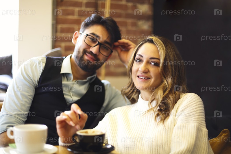 Пара в ресторане ест десерт и пьет кофе