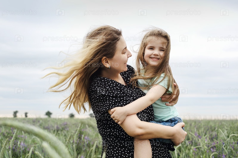 Счастливая мать и дочь с букетом полевых цветов обнимаются на зеленом лугу