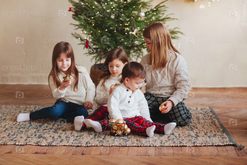 Счастливые четверо маленьких братьев и сестер, три сестры и младший брат в теплых вязаных свитерах собрались вокруг елки