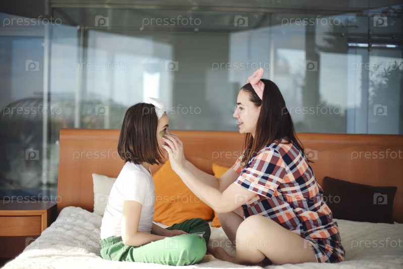 Веселая молодая мать сидит на кровати с дочерью в спальне и накладывает повязки на глаза