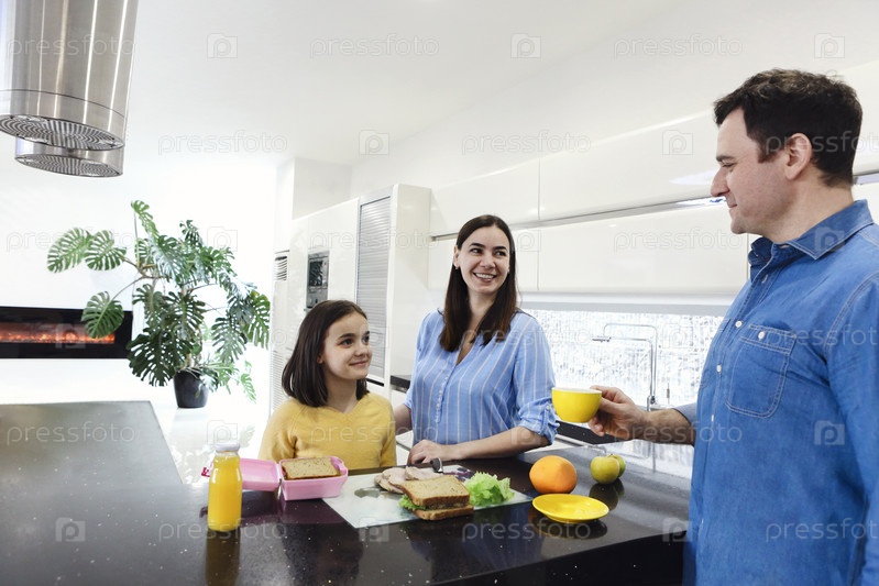 Счастливая улыбающаяся молодая семья наслаждается здоровым завтраком вместе с маленькой дочерью на современной кухне