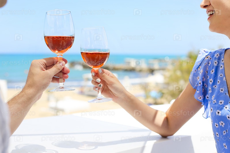 Руки пары, наслаждающейся бокалами розового вина на тропическом пляже