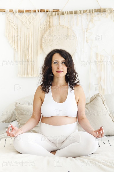 Красивая брюнетка беременная женщина растягивается и занимается йогой
