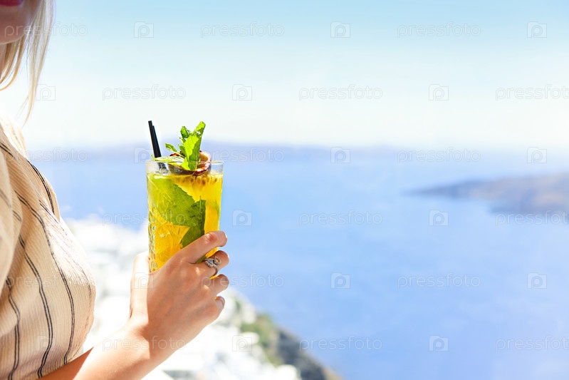 Женщина, держащая стакан коктейля из маракуйи на фоне Санторини