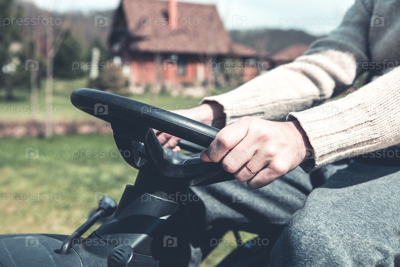Мужчина работает во время езды на газонокосилке во дворе