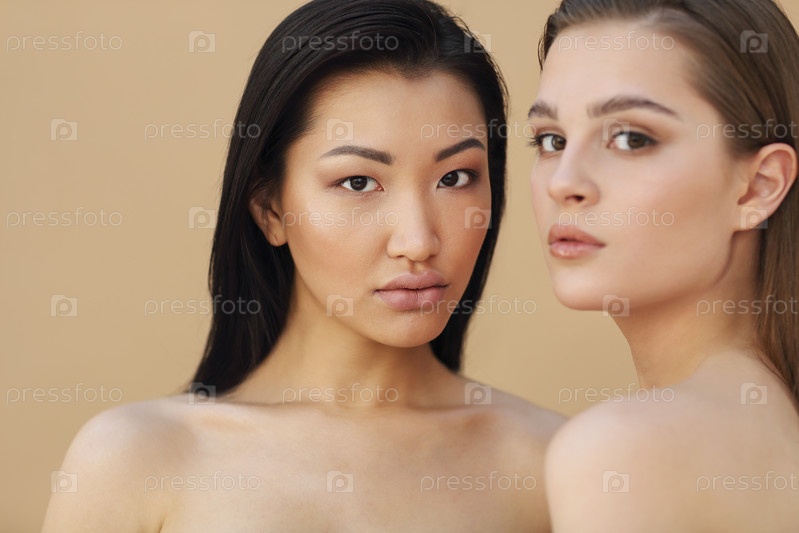 Две красивые мультикультурные молодые женщины обнимаются, позируя перед камерой