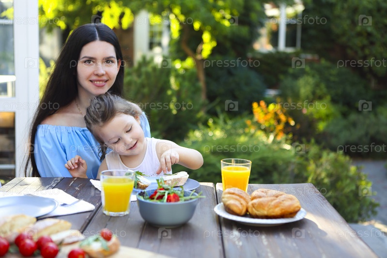 Женщина с дочерью обедает в саду